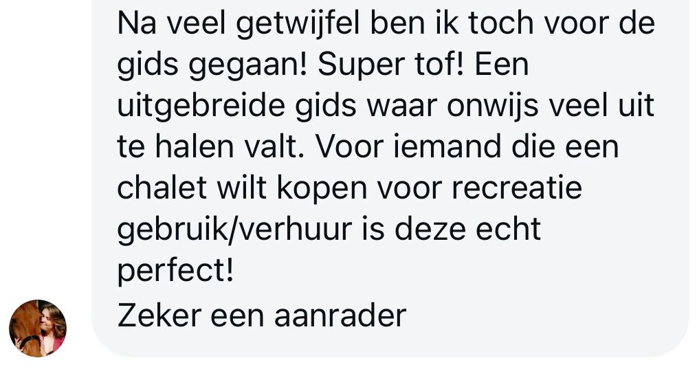 De Chef Chalet Aankoopgids neemt je stap voor stap mee door het hele proces. In 67 pagina’s leg ik alles haarfijn uit wat je moet weten om goed voorbereid een chalet aan te schaffen. Of het nu gaat om grote keuzes of kleine details, ik laat je zien waar je op moet letten zodat je niets belangrijks mist.
